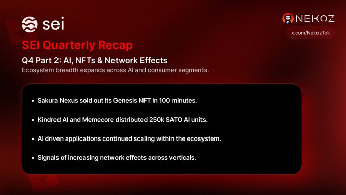 Câu 4, Phần 2 dành cho $ Sei. Hoạt động của AI và người tiêu dùng đã tăng mạnh. Sakura Nexus đã bán hết NFT Genesis của mình một cách nhanh chóng, trong khi Kindred AI và Memecore đẩy mạnh việc phân phối đơn vị AI quy mô lớn on-chain. Nhiều lĩnh vực khác nhau đang đồng thời cho thấy sự tăng trưởng. Hiệu ứng mạng lưới bắt đầu lan rộng.