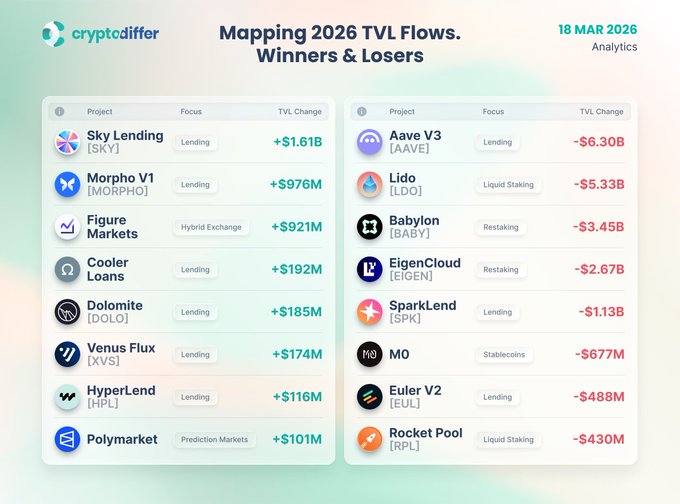 Phân tích dòng chảy Tổng giá trị khóa (TVL) năm 2026. Người thắng và người thua. Việc theo dõi sự thay đổi Tổng giá trị khóa (TVL) giúp xác định nơi thanh khoản đang tập trung và nơi nó đang rời khỏi thị trường. Trong khi một số giao thức thu hút dòng vốn vào, DeFi nói chung đã mất 28,96 tỷ USD Tổng giá trị khóa (TVL) kể từ đầu năm 2026.
