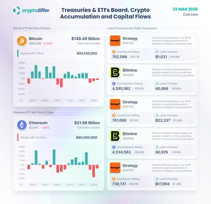 Hội đồng quản trị về trái phiếu kho bạc và ETF. Tích lũy tiền điện tử và dòng Vốn. Các quỹ ETF giao ngay $BTC ghi nhận dòng vốn ròng vào khoảng 93,1 triệu đô la trong tuần trước, kéo dài chuỗi bốn tuần liên tiếp có dòng vốn dương. Trong khi đó, dòng vốn chảy ra khỏi các quỹ ETF $ETH lên tới khoảng 60,0 triệu đô la.