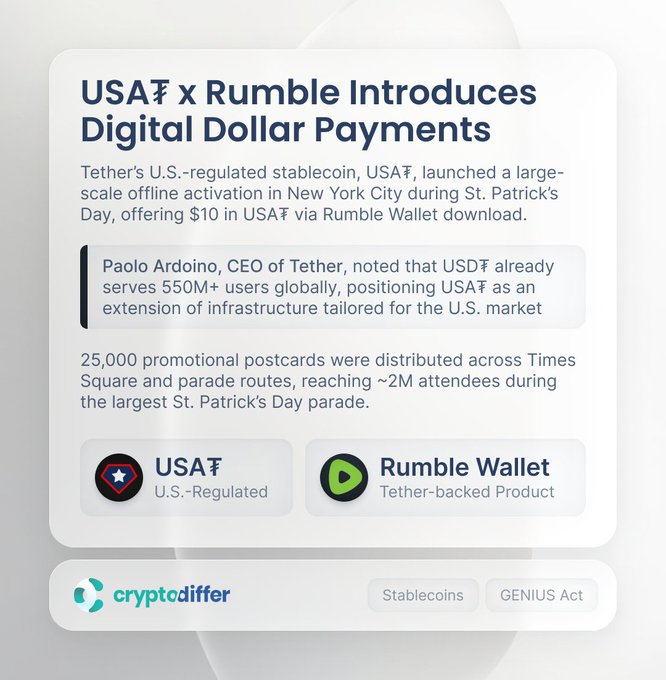 USA₮ x Rumble Wallet giới thiệu thanh toán bằng đô la kỹ thuật số Đồng tiền ổn định $USAT được Tether quản lý tại Hoa Kỳ đã khởi động một chiến dịch quảng bá quy mô lớn tại thành phố New York trong dịp Lễ Thánh Patrick, tặng $10 bằng #USAT thông qua việc tải xuống ví Rumble Wallet. 👉 http:/x.com/usat/status/203398...… twitter.com/CryptoDiffer/statu...