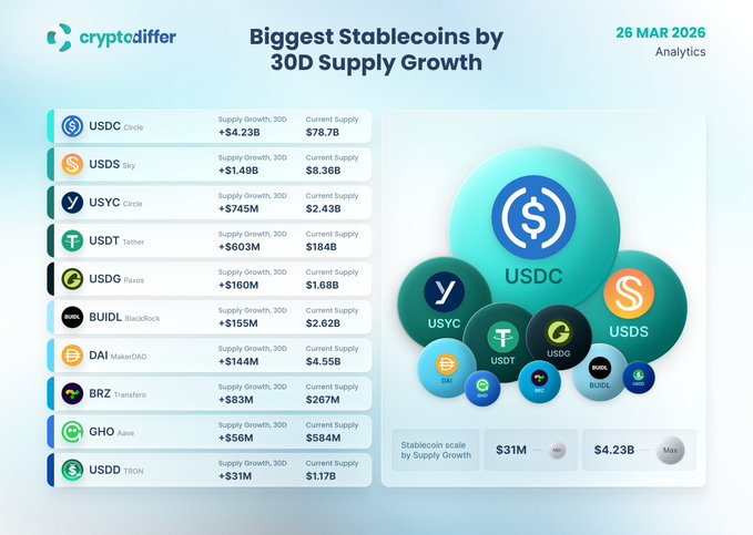 Các Stablecoin lớn nhất theo mức tăng trưởng nguồn cung 30 ngày $USDC thống trị sự tăng trưởng của #stablecoin, bổ sung nguồn cung nhiều hơn so với phần còn lại trong bảng xếp hạng. Trong khi đó, sự gia tăng của $USYC, $BUIDL & $BRZ cho thấy nhu cầu đang mở rộng vượt ra ngoài tính thanh khoản của #đô la sang #tiền on-chain và các sản phẩm tập trung vào lợi suất.