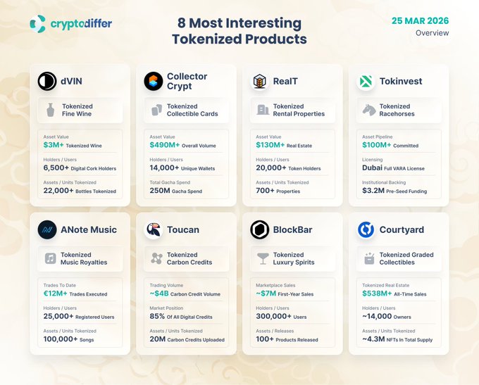 Từ đồ sưu tầm đến rượu vang: 8 sản phẩm được mã hóa thú vị nhất #RWA đang trở nên đa dạng hơn, và thị trường đang bắt đầu phản ánh điều đó. Những dự án này cho thấy cách #mã hóa đang được áp dụng cho các sản phẩm mà mọi người thực sự có thể hiểu, sưu tầm hoặc kiếm tiền từ đó.