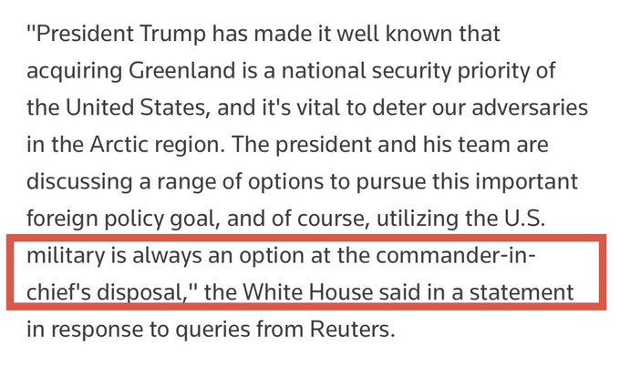TIN NÓNG: Nhà Trắng cho biết Tổng thống Trump đang cân nhắc việc sử dụng quân đội Mỹ để mua lại Greenland.