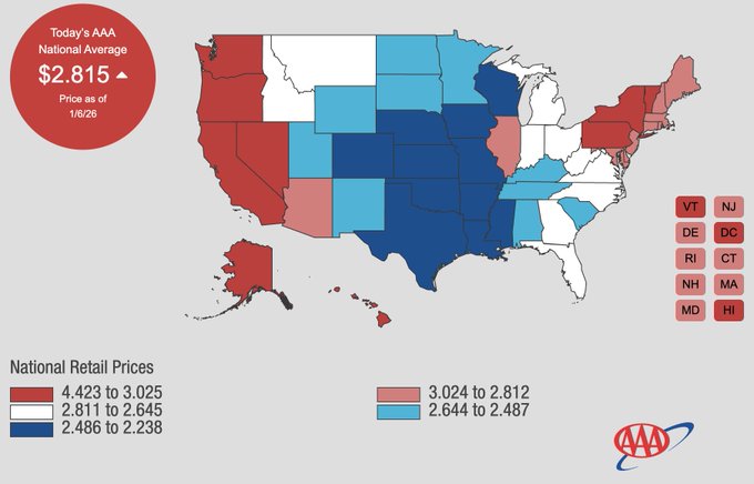 Thông báo chính thức: Giá gas tại Mỹ hiện đã giảm xuống mức trung bình 2,81 đô la/gallon, mức thấp nhất kể từ năm 2021. Các hộ gia đình Mỹ dự kiến sẽ tiết kiệm được 11 tỷ đô la tiền xăng vào năm 2026 so với năm 2025.