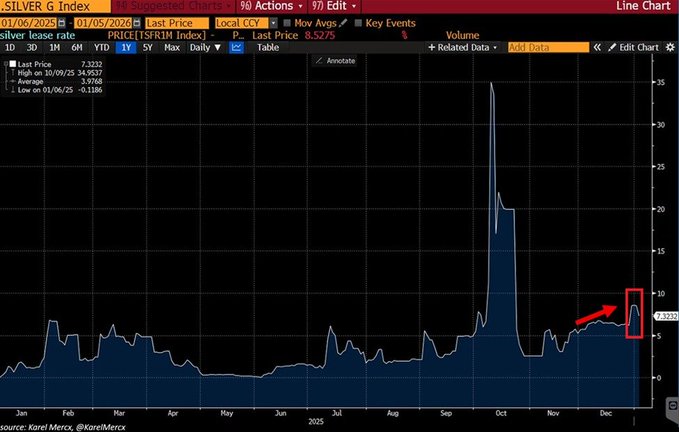 Thị trường bạc vẫn đang khan hiếm chưa từng có: Lãi suất cho thuê bạc, chi phí vay bạc kỳ hạn 1 tháng tại Anh, ở mức khoảng 7,3%, cao hơn nhiều so với mức trung bình được ghi nhận vào năm 2025. Trong điều kiện thị trường bình thường, lãi suất cho thuê bạc sẽ ở mức 0 khi cung và cầu cân bằng.