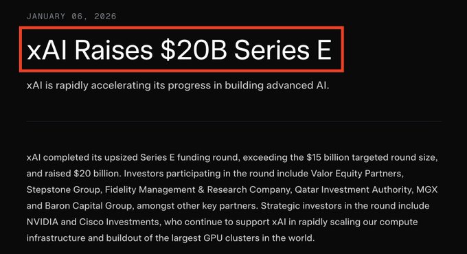 TIN NÓNG: xAI của Elon Musk thông báo đã huy động được 20 tỷ đô la trong vòng gọi vốn Series E, vượt xa kỳ vọng 15 tỷ đô la. Nvidia được liệt kê là "nhà đầu tư chiến lược" để hỗ trợ "xây dựng các cụm GPU lớn nhất thế giới." Hiện vẫn còn sớm.