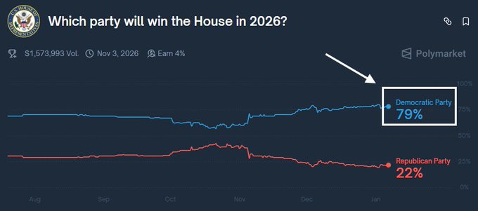 TIN NÓNG: Tỷ lệ thắng của đảng Dân chủ tại Hạ viện Hoa Kỳ trong cuộc bầu cử giữa nhiệm kỳ năm 2026 đã tăng lên 79%, theo Polymarket. Thị trường cho rằng đảng Cộng hòa sẽ thua trong cuộc bầu cử giữa nhiệm kỳ. twitter.com/KobeissiLetter/sta...