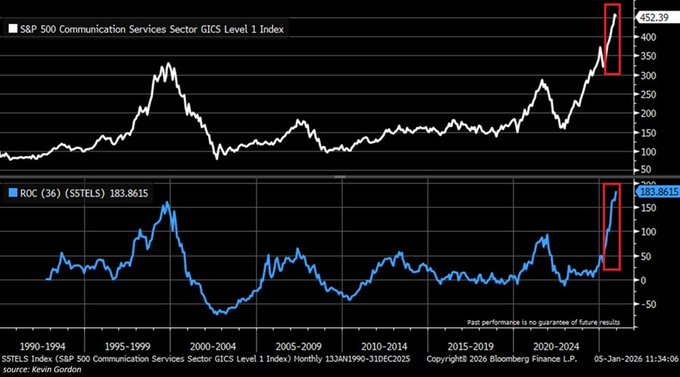 Sự bùng nổ công nghệ tại Mỹ là chưa từng có tiền lệ: Chỉ số ngành dịch vụ truyền thông S&P 500 đã tăng +184% trong 3 năm qua, mức tăng trưởng 3 năm mạnh nhất từ trước đến nay. Con số này vượt qua kỷ lục trước đó là +155% được thiết lập trong thời kỳ bong bóng dot-com năm 2000. Kể từ đáy thị trường gấu năm 2022,