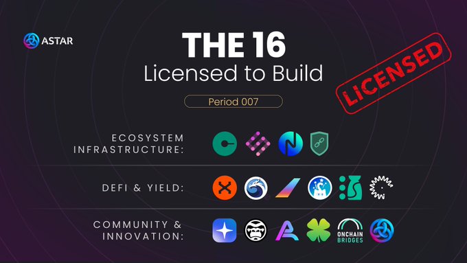 Giai đoạn 007 của chương trình dApp Staking đang diễn ra. Hiện tại, 16 dự án đang hoạt động trên Astar đã được cấp phép xây dựng trong chu kỳ này và có thể nhận được hỗ trợ Staking từ những người nắm giữ ASTR .