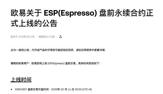 OKX sẽ ra mắt hợp đồng vĩnh cửu ESP (Espresso) trước khi mở bán chính thức vào ngày 11 tháng 2.