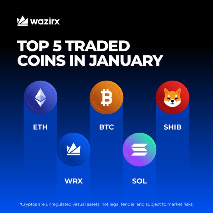 Top 5 đồng tiền điện tử được giao dịch nhiều nhất trên WazirX trong tháng 1: 🚀 $ETH 🚀 $BTC 🚀 $SHIB 🚀 $WRX 🚀 $SOL Bạn đã giao dịch loại nào nhiều nhất?