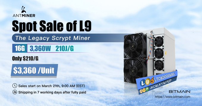 ⚡ Giảm giá đặc biệt: ANTMINER L9 ✨ Phần mềm khai thác Scrypt cổ điển dành cho LTC & Doge! ✅ Thông số kỹ thuật: - 16G - 3.360W - 210J/G 💰 210 USD/G | Chỉ 3.360 USD/Unit 🕐 Sản phẩm có bán trên trang web chính thức 📦 Giao hàng trong vòng 7 ngày làm việc sau khi thanh toán đầy đủ