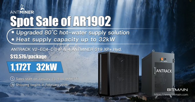 🔥 Giảm giá đặc biệt: Gói nâng cấp Đào coin và sưởi ấm AR1902 ✨ Giải pháp cung cấp nước nóng 80°C (Công suất nhiệt lên đến 32kW) ✅ Chi tiết gói hàng: - COMBO: ANTRACK V2-EC4-DTHP + 4×ANTMINER S19 XP+ Hyd. - Tổng tốc độ băm: 1.172T - Công suất: 32kW 💰 13.576 đô la/gói hàng 🕐 Sản phẩm có bán trên trang web chính thức 📦 Việc giao hàng bắt đầu vào tháng 2 năm 2026