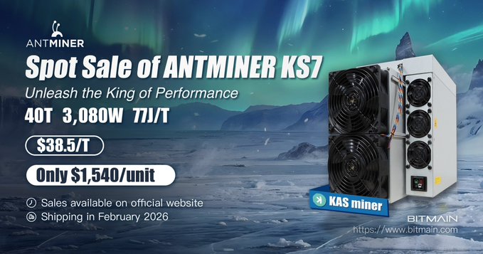 ⚡ Giảm giá đặc biệt: ANTMINER KS7 🔥 Giải phóng sức mạnh của Vua hiệu năng (KAS Miner)! ✅ Thông số kỹ thuật: · 40T • 3.080W · 77J/T 💰 38,5 đô la/ly Chỉ $1.540/đơn vị 🕐 Sản phẩm có bán trên trang web chính thức 📦 Giao hàng trong vòng 7 ngày làm việc sau khi thanh toán đầy đủ