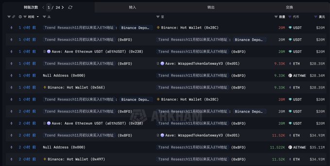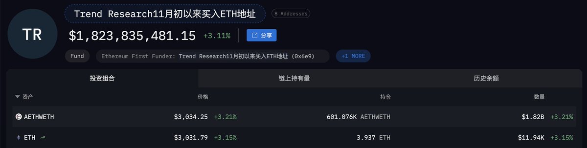 Chiều nay, @Trend_Research, một tổ chức đầu tư thứ cấp thuộc Jackyi (@Jackyi_ld), đã tăng lượng cổ phần nắm giữ thêm 20.850 ETH (tương đương 63,28 triệu USD). Sau đó, họ vay thêm 40 triệu USDT từ Aave và chuyển sang Binance, điều này có nghĩa là các giao dịch mua ETH bằng đòn bẩy của họ vẫn đang tiếp diễn. Hiện tại, họ đang nắm giữ tổng cộng 601.076 ETH (1,82 tỷ USD) thông qua vay nợ vay mượn, với chi phí trung bình khoảng [thông tin bị thiếu]. twitter.com/EmberCN/status/200...