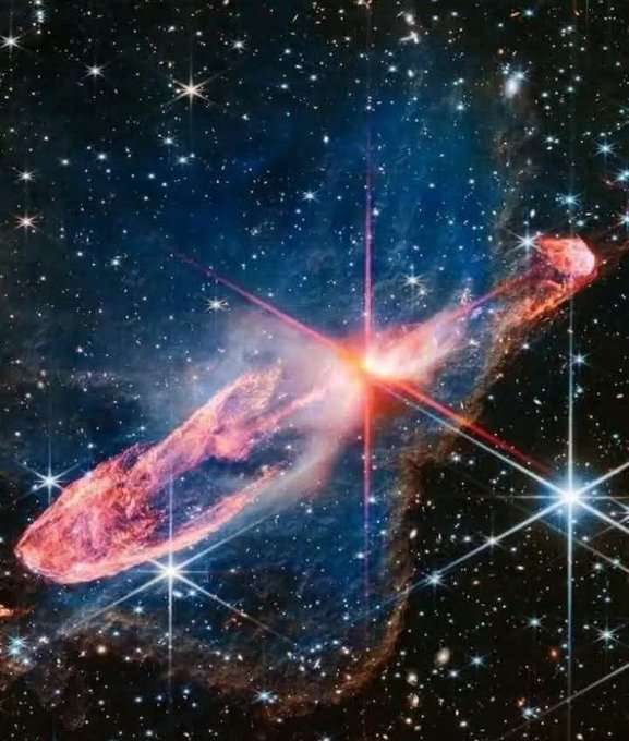 Kính viễn vọng không gian James Webb của NASA đã chụp được hình ảnh một cặp sao đang hình thành tích cực, liên kết chặt chẽ với nhau, được gọi là Herbig-Haro 46/47, bằng ánh sáng cận hồng ngoại độ phân giải cao. (NASA, ESA)