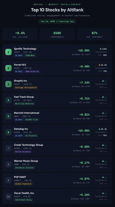 $SPOT (+15,09%) - Kết quả kinh doanh quý 4 vượt trội. EPS đạt 4,43 đô la so với ước tính 2,74 đô la. 751 triệu người dùng hoạt động hàng tháng (+11% so với cùng kỳ năm ngoái), 290 triệu người đăng ký trả phí. Tương tác trên mạng xã hội đạt 126 nghìn, cao hơn 619% so với mức trung bình hàng ngày. Chương trình khuyến mãi Wrapped đã giúp tăng kỷ lục 38 triệu người dùng trong quý 4.