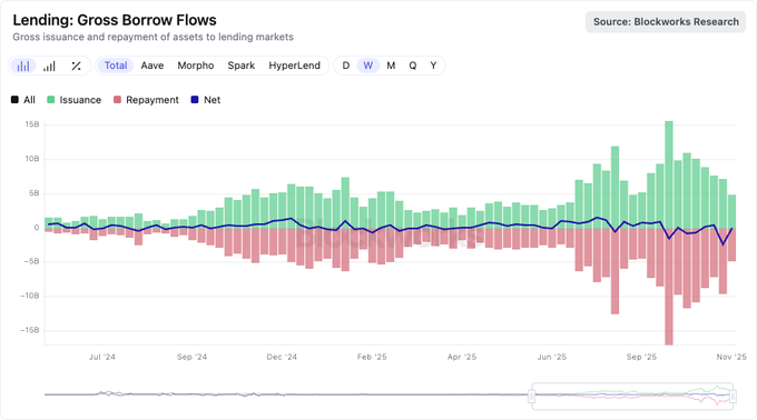 Tổng số tiền phát hành và trả nợ trên AAVE, Morpho, Spark và Hyperlend đạt đỉnh vào cuối tháng 9/đầu tháng 10.