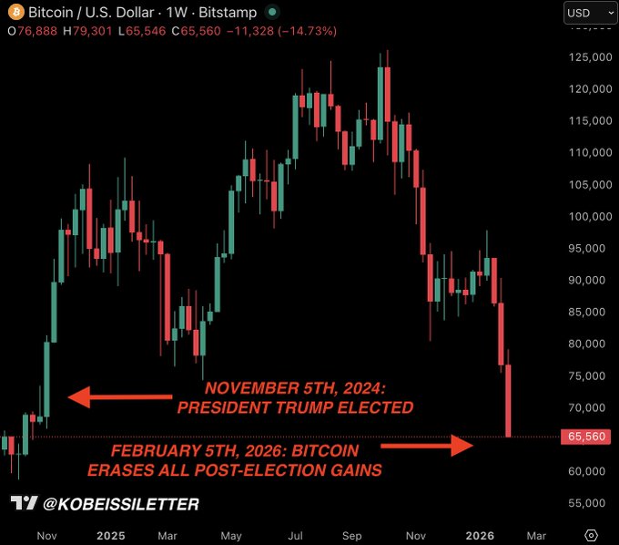 Thông báo chính thức: Bitcoin đã xóa sạch toàn bộ lợi nhuận kể từ khi Tổng thống Trump đắc cử vào ngày 5 tháng 11 năm 2024. Bitcoin hiện đã giảm -6% kể từ khi ông Trump đắc cử. Điều này có hợp lý không hay các nhà đầu tư đang bị lạc lối trong "sự nhiễu loạn thông tin"?