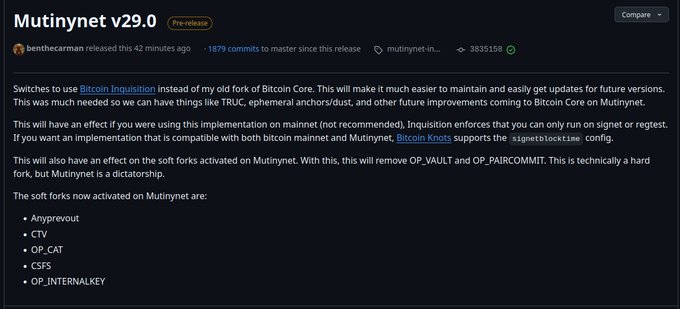 Mutinynet đã được nâng cấp! Hiện tại, nó đang chạy bằng Fork bitcoin-inquistion của bitcoin core thay vì tôi phải tự bảo trì. Điều này có nghĩa là cuối cùng mọi người có thể ngừng yêu cầu tôi chuyển tiếp gói tin trên Mutinynet!