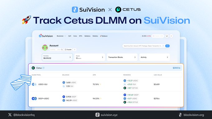 🌊 SuiVision Explorer hiện hỗ trợ @CetusProtocol DLMM Dễ dàng theo dõi danh mục đầu tư Sui DeFi của bạn trên http:/suivision.xyz!