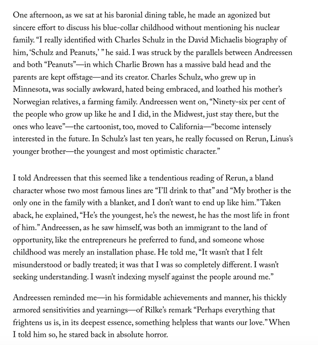 Khi tạp chí New Yorker viết chân dung Marc Andreessen, ông ấy gần như hoàn toàn từ chối thảo luận về quá trình trưởng thành thực sự của mình và thay vào đó nói về Charles Schulz. Khi tác giả gợi ý một bài thơ của Rilke có thể làm sáng tỏ hoàn cảnh của ông, "ông ấy nhìn lại với vẻ kinh hãi tột độ."