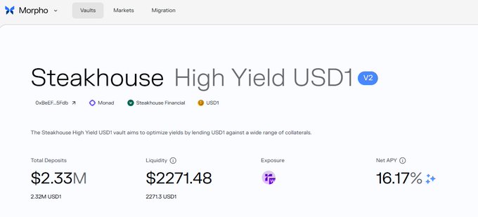 USD1 vừa ra mắt một số tính năng mới hữu ích, làm phong phú thêm các trường hợp sử dụng và ứng dụng thực tiễn của nó. @worldlibertyfi 1️⃣ Ra mắt chứng khoán vĩnh viễn trong ví Binance. USD1 cung cấp mức phí giao dịch ưu đãi hơn cho việc giao dịch hợp đồng vĩnh viễn BTC, ETH và SOL, với 0bps cho lệnh chờ và 0,5bps cho lệnh chốt. Bạn cũng có thể tham gia chương trình khích lệ WLFI của Aster: ▪️Có thể nhận được tới 2,5 triệu token WLFI dưới dạng phần thưởng giao dịch mỗi tháng, được phân phối hàng tuần.▪️Người người nắm giữ 1 USD đủ điều kiện có thể nhận thêm khích lệ hàng tháng. ▪️1 USD có thể được sử dụng trực tiếp làm tài sản tiền ký quỹ chấp ký quỹ. 2️⃣ BitGo cung cấp hỗ trợ cấp độ tổ chức cho việc triển khai. Nền tảng Mint mới ra mắt của BitGo hỗ trợ 1 USD ngay từ ra mắt đầu tiên, đây là một bước phát triển quan trọng đối với các tổ chức. Khách hàng tổ chức giờ đây có thể hoàn tất đúc, quy đổi và quản lý USD1 trong hệ thống lưu ký của BitGo chỉ trong một bước duy nhất, đơn giản hóa đáng kể quy trình trước đây đòi hỏi nhiều nhà cung cấp dịch vụ bên ngoài và các bước rườm rà. Nền tảng này cung cấp khả năng kiểm soát chính sách được quản lý, báo cáo tuân thủ tích hợp sẵn và các dịch vụ cấp độ tổ chức hỗ trợ các giao dịch tần suất cao, khối lượng lớn. Mở rộng USD1 sang cơ sở hạ tầng dành cho tổ chức đang ngày càng trở nên liền mạch hơn. 3️⃣ Kho tiền ảo USD1 đầu tiên ra mắt Trong không gian DeFi, quỹ USD1 đầu tiên trên Morpho cũng đã chính thức được ra mắt. Kho tiền này được bảo đảm bằng tài sản thế chấp do Reservoir cung cấp, được Steakhouse lên kế hoạch và hiện đang được triển khai trên Chuỗi Monad. Người dùng có thể tham gia vay mượn và kiếm lợi nhuận chỉ bằng cách chuyển 1 USD qua Chuỗi đến Monad thông qua LayerZero và sau đó gửi vào kho tiền. Tỷ suất lợi nhuận hàng năm hiện tại là hơn 16% (có thể biến động). Nhìn chung, USD1 đang dần mở rộng từ một stablecoin duy nhất sang nhiều lĩnh vực khác nhau như giao dịch vĩnh cửu, lưu ký tổ chức và lợi nhuận từ DeFi. Dù bạn là người dùng thông thường hay một tổ chức, bạn đều có thể tìm ra cách sử dụng phù hợp dựa trên nhu cầu của mình. 🤔 twitter.com/vvickym2/status/20...