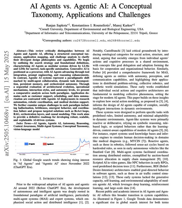 AI Agents so với Agentic AI Bài báo thú vị tóm tắt sự khác biệt giữa AI Agents và Agentic AI. Bài báo cũng đề cập đến các ý tưởng chính, giải pháp và tương lai. Sau đây là ghi chú của tôi: