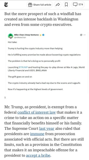 Bài tweet của tôi về việc Trump đang gây hại cho ngành công nghiệp tiền điện tử nhiều hơn là giúp đỡ vừa được đưa vào một bài báo của @nytimes! Hy vọng tôi sẽ không bị trục xuất đến El Salvador <Link> đến bài báo và tweet gốc bên dưới