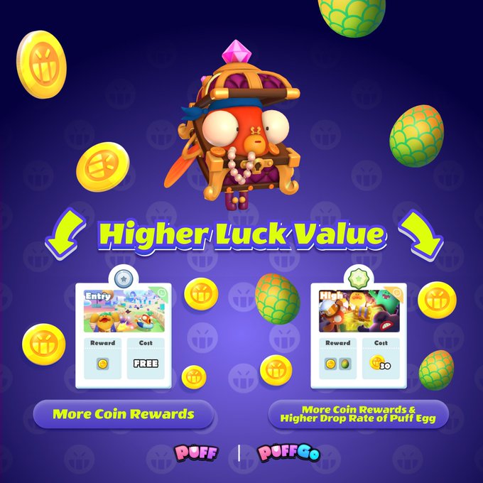 Mẹo chơi thông minh của Puff từ thực tế 🏆 Giá trị May mắn Cao mở khóa nhiều khả năng trong #Puffverse 👍 Nên khóa NFT Puff vào #SkilltoEarn NFT Giá trị May mắn Cao = 🥚 Nhiều Xu hơn & tỷ lệ rơi Trứng Puff cao hơn trong #PuffGo 🎁 Tăng sao xếp hạng trong mùa giải 🤩 ... CHƠI THÔNG MINH