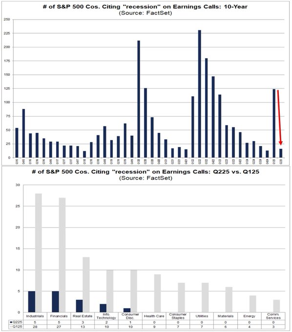 Số lượng các công ty đề cập đến "suy thoái" trong các cuộc gọi về kết quả kinh doanh đã sụp đổ: từ 124 trong quý 1 xuống còn 16 trong quý 2 (với 90% đã báo cáo). qua @FactSet