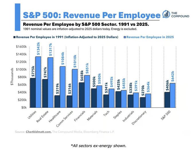 Hiện nay, cần 1,55 nhân viên của các công ty S&P 500 để tạo ra 1 triệu đô la doanh thu ... Vào năm 1991, để tạo ra cùng một khoản doanh thu 1 triệu đô la (đã điều chỉnh theo lạm phát, đừng tranh luận với tôi), đã mất 2,46 nhân viên. @mattcerminaro