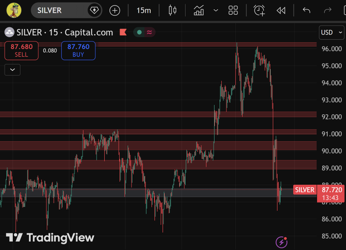 Giá bạc giảm -7% trong 2 giờ Hiện đang giao dịch ở mức 87 USD/ounce Giá vàng cũng giảm nhưng nhanh chóng phục hồi trở lại