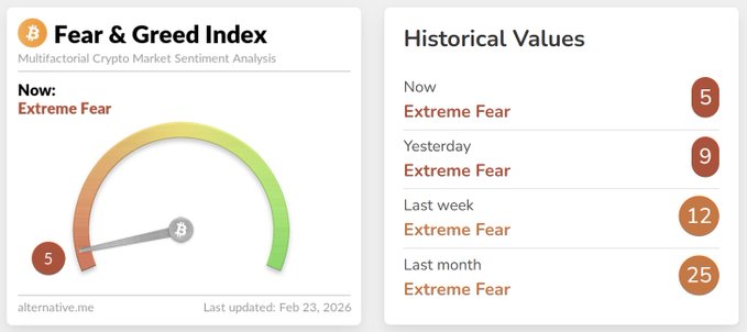 Chỉ số Sợ hãi & Tham lam trong tiền điện tử giảm xuống còn 5 quay trở lại mức độ từng thấy trong thị trường gấu năm 2022 lần cuối cùng chúng ta chứng kiến mức độ sợ hãi này $BTC là ở mức 20.000 đô la