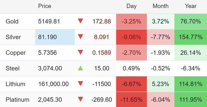 Giá kim loại tiếp tục giảm mạnh hôm nay. 📉 Vàng: 5.149 USD (-3,25%) 📉 Bạc: 81,19 USD (-9,06%) Đây có phải là một đợt điều chỉnh lành mạnh… hay là dấu hiệu của một đợt giảm giá lớn hơn?