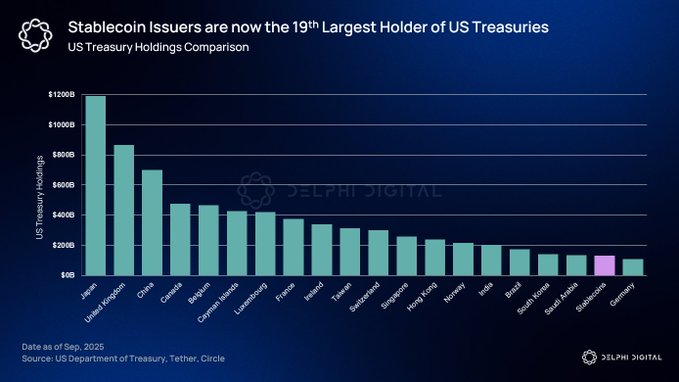 Những biểu đồ quan trọng nhất của loạt bài năm 2025: Các nhà phát hành Stablecoin hiện đang nắm giữ nhiều trái phiếu kho bạc Mỹ hơn cả Đức, và đã rất gần với Ả Rập Xê Út. Sự hợp nhất giữa Web3 và TradFi là điều không thể tránh khỏi, dù bạn thích hay không thích.