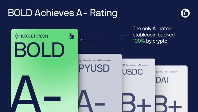 Phi tập trung hóa thuần túy đã đạt đến một chuẩn mực mới. BOLD vừa nhận được xếp hạng A- từ @bluechip_org, vượt trội hơn cả những ông lớn như USDC và Dai hiện đang ở mức B+. Mặc dù PYUSD cũng đạt điểm A-, nhưng nó lại phụ thuộc rất nhiều vào các công cụ tài chính truyền thống. BOLD đang làm điều đó. twitter.com/lordjorx/status/20...