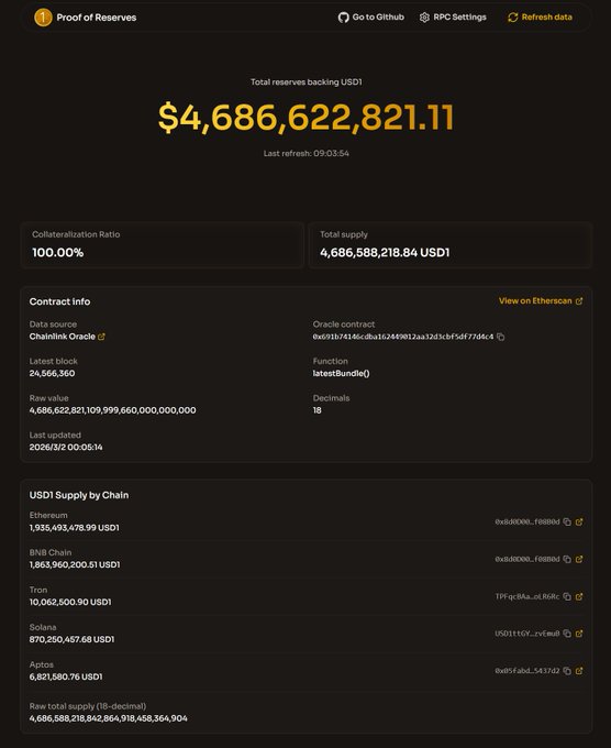 Lần đối mặt với làn sóng chỉ trích, USD1 ra mắt " bằng chứng dự phòng thời gian thực" trên Chuỗi , trở thành stablecoin đầu tiên thực hiện công khai thông tin theo ra mắt thực. Nó cũng được BitGo, một tổ chức lưu ký hàng đầu toàn cầu, quản lý một cách tuân thủ quy định, đảm bảo an toàn cho tài sản cơ bản. Nhiều stablecoin hoạt động trên cơ sở gần thời gian thực, với việc công khai thông tin hàng tuần và kiểm toán hàng tháng/hàng quý, dẫn đến độ trễ thông tin đáng kể. Điều này khác với bằng chứng dự phòng thời gian thực của USD1. Giám sát thời gian thực có nghĩa là bất kỳ thay đổi nào trong quỹ của nhà phát hành sẽ ngay lập tức kích hoạt cảnh báo Chuỗi. Miễn là lượng dự trữ Chuỗi đủ, sự hoảng loạn sẽ lắng xuống. Tình trạng hiện tại của USD1 là: bất kỳ thay đổi nào trong dự trữ đều được đồng bộ hóa ngay lập tức Chuỗi thời gian dữ liệu, giảm đáng kể rủi ro trạng rút tiền ồ ạt khỏi sàn giao dịch. twitter.com/BuTongRen6/status/...