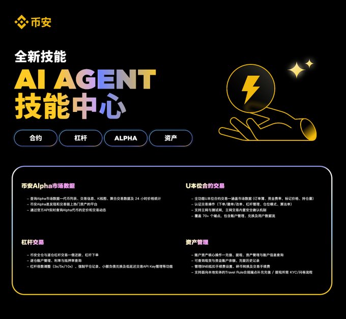 Một hình ảnh minh họa giúp bạn hiểu rõ hơn về bốn kỹ năng mới từ Binance. Các kỹ năng của Binance đã được nâng cấp một lần nữa, với bốn kỹ năng AI Agent hoàn toàn mới hiện đã có sẵn, mở rộng khả năng của chúng sang phái sinh, đòn bẩy, alpha và quản lý tài sản. Những người chưa cài đặt chúng được khuyến khích nên cài đặt và trải nghiệm thử. Bạn có thể trực tiếp yêu cầu "Tôm Hùm" cài đặt chỉ bằng một cú nhấp chuột. http:/github.com/binance/binan...… Vậy chính xác thì những kỹ năng của tác nhân AI này có thể làm được gì? Trước tiên, hãy cùng xem xét bốn kỹ năng được cập nhật này: Dữ liệu thị trường Binance Alpha, Giao dịch hợp đồng tương lai dựa trên USDT, Giao dịch đòn bẩy và Quản lý tài sản . Bạn sẽ thấy rằng chúng tương ứng với một số tình huống được sử dụng thường xuyên nhất và cốt lõi đối với nhiều người. Dữ liệu thị trường Binance Alpha: Truy vấn dữ liệu thị trường Alpha — danh sách token, thông tin giao dịch, biểu đồ nến, dữ liệu giao dịch tổng hợp và thống kê giá 24 giờ. - Giao dịch hợp đồng dựa trên U: Hỗ trợ xem dữ liệu thị trường hợp đồng, đồng thời hỗ trợ đặt đặt lệnh trực tiếp, hủy lệnh, sửa đổi lệnh, điều chỉnh đòn bẩy và các thao tác khác. Có sẵn trên mainnet và mạng thử nghiệm. - Giao dịch đòn bẩy: Hỗ trợ giao dịch Ký quỹ chéo/ký quỹ Ký quỹ riêng, bao gồm vay và trả nợ, đặt lệnh bẩy, quản lý tài khoản và tra cứu thông tin như lãi suất và tỷ lệ tài sản thế chấp. - Quản lý tài sản: Hỗ trợ truy vấn số dư tài khoản, lịch sử gửi và rút tiền, cũng như thực hiện các thao tác quản lý tài sản thông thường như nạp tiền , rút tiền, chuyển đổi tiền tệ lẻ và thiết lập phí giao dịch. // Ngoài ra, bạn cũng có thể tự xây dựng các ứng dụng dựa trên nhu cầu sử dụng và kịch bản mục tiêu của mình. Tôi đã thấy nhiều người tạo ra những trường hợp sử dụng khá tốt. Có rất nhiều cách để sử dụng nó; tôi dự định bắt đầu với những kịch bản phổ biến nhất. Tôi vẫn đang nghiên cứu chuyên sâu và sẽ chia sẻ bất kỳ trường hợp sử dụng tốt nào mà tôi tìm ra. Gần đây, Binance cũng đang tổ chức cuộc thi OpenClaw Lobster với tổng giải thưởng là 48,6 BNB. 123 bài dự thi hàng đầu sẽ nhận được lần lượt 10/8/6 BNB, và cũng có 20 giải thưởng khuyến khích trị giá 1 BNB mỗi giải. Dù sao thì, tôi sẽ bắt đầu nghiên cứu và tạo ra một cái gì đó mới ngay bây giờ. twitter.com/BuTongRen6/status/...