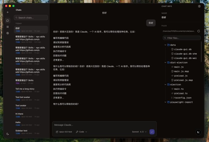 Tuyệt vời! Bạn bè của tôi thật tuyệt! Nhờ Opus 4.6 và đội ngũ hỗ trợ, họ đã giúp tôi hoàn thành phiên bản giao diện người dùng Cloud Code cho một sản phẩm mà tôi luôn muốn tạo ra chỉ trong chưa đầy một giờ. Nó có những đặc điểm sau: 1. Tất cả các cấu hình đều được liên kết với Cloud Code cục bộ của bạn. 2. Quản lý và cấu hình Cloud Code trực quan 3. MCP, kỹ năng và plugin có thể được cấu hình trực quan. 4. Hỗ trợ tương tác với Cloud Code cục bộ của bạn. 5. Lưu lịch sử trò chuyện của bạn twitter.com/op7418/status/2019...