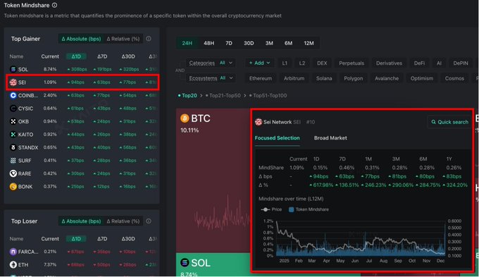 Sei đã vươn lên top 10 về mức độ nhận diện thương hiệu với tư cách là một trong Token tăng trưởng mạnh nhất, đạt Cao nhất mọi thời đại mới theo @KaitoAI.