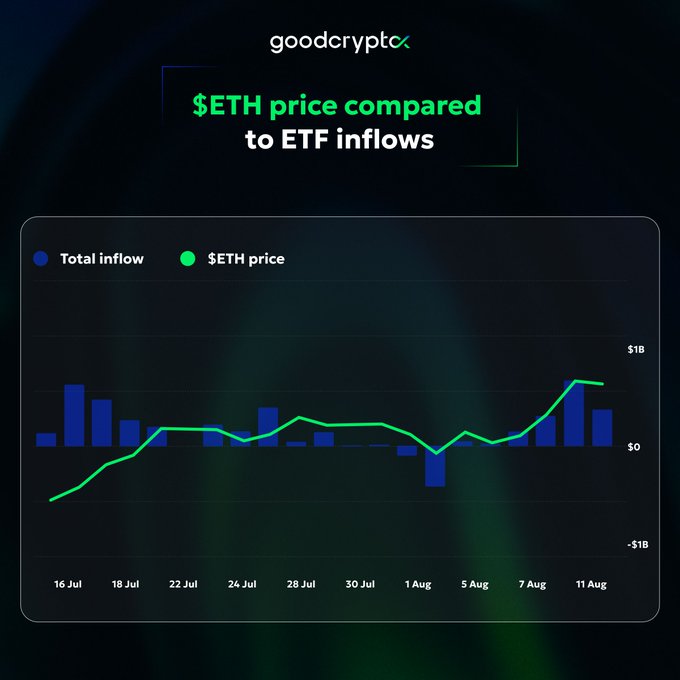 📈 Ethereum vượt mốc 4.600 đô la, đánh dấu mức tăng 55% trong tháng qua. Sự tăng trưởng này chủ yếu được thúc đẩy bởi quỹ ETF giao ngay ETH , với dòng vốn đổ vào đạt 1,02 tỷ đô la vào ngày 12 tháng 8, trở thành tổng giá trị trong một ngày lớn nhất kể từ khi ra mắt vào tháng 7 năm 2024.