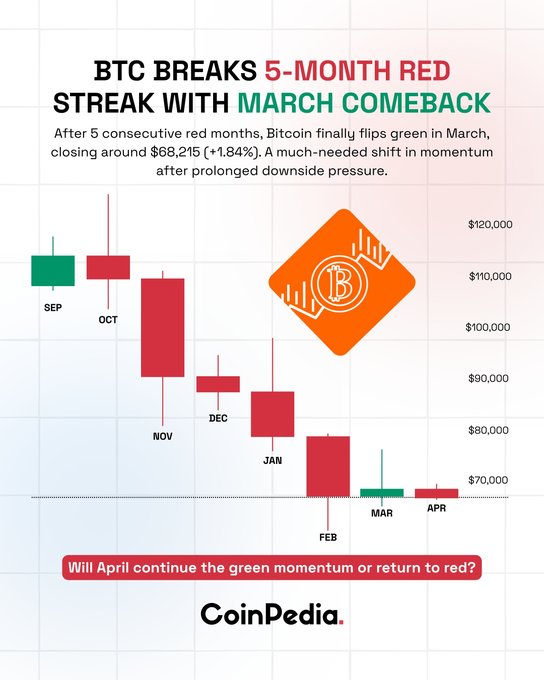 $BTC Chấm dứt chuỗi 5 tháng giảm giá 🔹#Bitcoin kết thúc chuỗi 5 tháng giảm giá với mức đóng cửa vững chắc ở $68,215. 🔹Phe bò đã trở lại, nhưng liệu tháng Tư có tiếp tục tăng điểm? #CoinPedia #CryptoNews #Blockchain #CryptoMarket