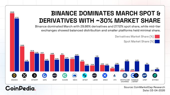 Tăng mạnh 30%: #Binance thống trị tháng 3 @binance dẫn đầu giao dịch tháng 3 với 29,86% thị phần trong thị trường phái sinh và 27,12% trong thị trường giao ngay, củng cố vị thế là sàn giao dịch hàng đầu. #CoinPedia #CryptoNews #Blockchain #CryptoMarket