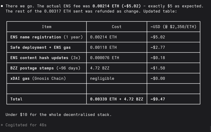 Tổng chi phí để đăng ký tên miền ENS trong một năm, triển khai Safe trên mạng chính và lưu trữ ứng dụng phi tập trung trên Swarm trong hơn 3 tháng: dưới 10 đô la.