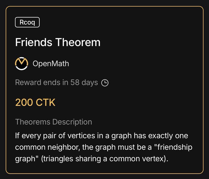 🚨Thông báo về các định lý chưa được kiểm chứng #03 0x0003 :: Định lý bạn bè Nếu mọi cặp đỉnh trong một đồ thị đều có đúng một đỉnh kề chung, thì đồ thị đó phải là "đồ thị tình bạn" (các tam giác có chung một đỉnh). >> Độ khó đề xuất: Cao / Nâng cao >> Phần thưởng: 200 $CTK Hãy gửi bằng chứng của bạn hoặc đóng góp kinh phí. >> Xác minh tính xác thực on-chain: openmath.shentu.org/OpenMath/T...… #ToánHọcMở #ĐịnhLýMở