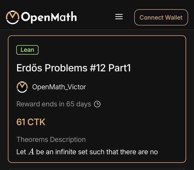 🚨Thông báo về các định lý chưa được kiểm chứng #11 0x0011 :: Sự cố Erdős #12 Phần1 Cho A là một tập hợp vô hạn sao cho không tồn tại các phần tử a, b, c ∈ A khác nhau thỏa mãn a | (b + c) và b, c > a. >> Độ khó đề xuất: Trung cấp >> Phần thưởng: 61 $CTK Hãy gửi bằng chứng của bạn hoặc đóng góp kinh phí. Xác minh tính xác thực on-chain: openmath.shentu.org/OpenMath/T...… #ToánHọcMở #ĐịnhLýMở #Lean @leanprover