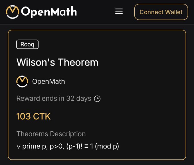 🚨Thông báo về các định lý chưa được kiểm chứng #05 0x0005 :: Định lý Wilson ∀ nguyên tố p, p>0, (p-1)! ≡ 1 (mod p) Độ khó đề xuất: Trung cấp Phần thưởng: 103 $CTK Hãy gửi bằng chứng của bạn hoặc đóng góp kinh phí. Xác minh tính xác thực on-chain: openmath.shentu.org/OpenMath/T...… #ToánHọcMở #ĐịnhLýMở