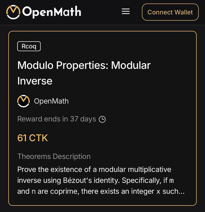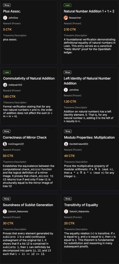 ⚠️Các nhà nghiên cứu đang tiến hành rất nhanh: 18 định lý đã được chứng minh trên OpenMath. Nếu bạn chưa xem bảng định lý, thì BÂY GIỜ là lúc thích hợp. Vẫn còn rất nhiều định lý đang chờ được giải. Hãy chọn định lý của bạn, viết chứng minh và gửi nó on-chain. Cùng xem ai sẽ chứng minh được bộ định lý tiếp theo nhé! ⚡️