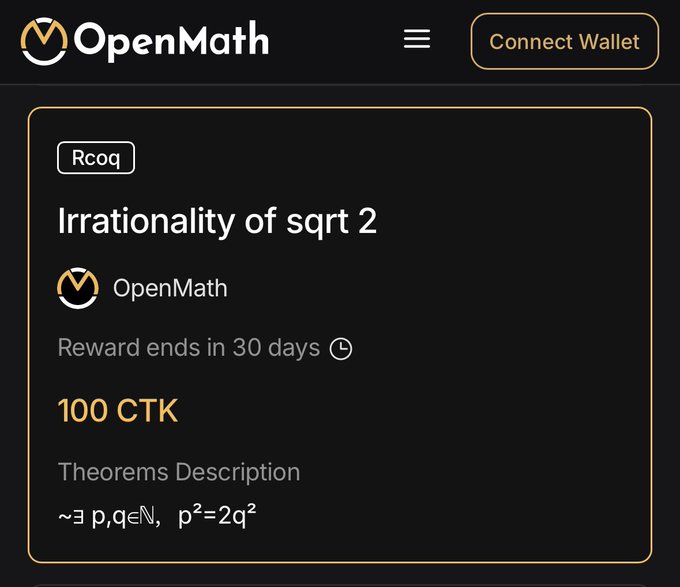 🚨Thông báo về các định lý chưa được kiểm chứng #06 0x0006 :: Tính vô lý của căn bậc hai của 2 ~∃ p,q∈ℕ,p²=2q² Độ khó đề xuất: Trung cấp Phần thưởng: 100 $CTK Hãy gửi bằng chứng của bạn hoặc đóng góp kinh phí. Xác minh tính xác thực on-chain: openmath.shentu.org/OpenMath/T...… #ToánHọcMở #ĐịnhLýMở